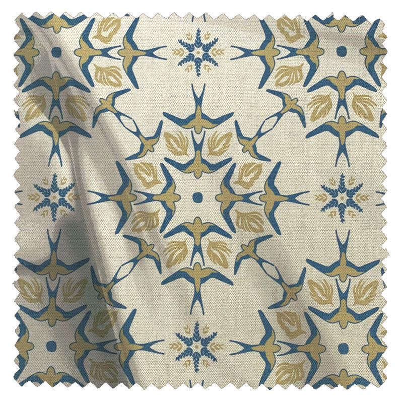 Characteristic of the Arts & Crafts period, this bold stylised print of swallows gathering to nest, shows the symmetry and simplicity of natural forms. Created during lockdown, this mid scale linen print reflects the movement and uplifting playful character of these graceful songbirds.